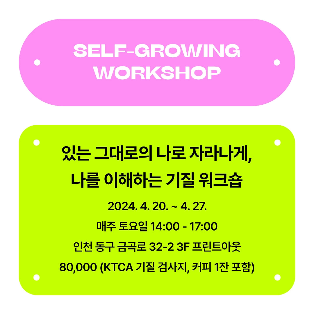 (4/20~4/27) 있는 그대로의 나로 자라날 수 있도록, 나의 타고난 기질을 이해하고 나에게 맞는 환경을 꾸려 보는 워크숍입니다.
